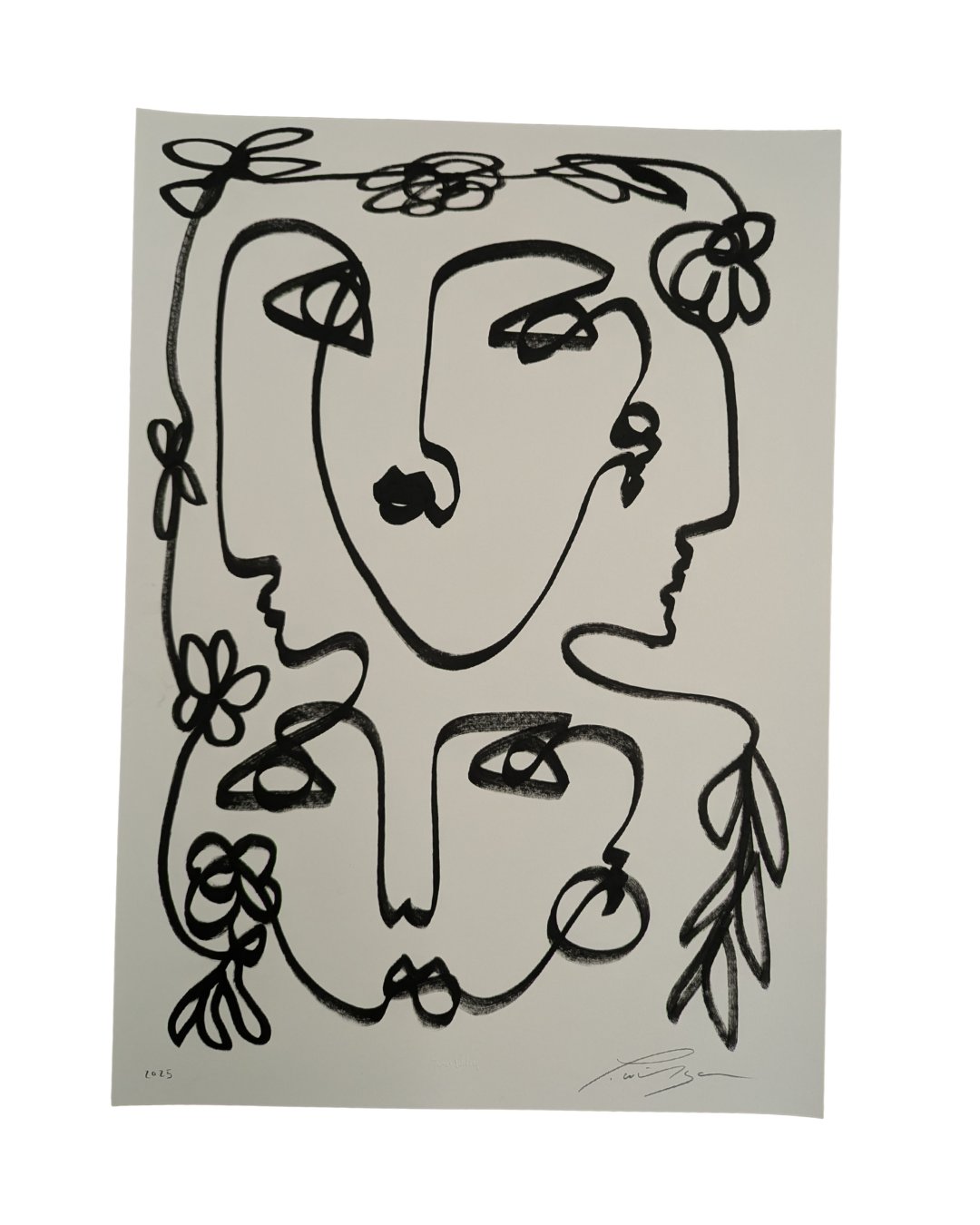 Blooming Conversations intertwines faces and florals into a single, looping movement. The work evokes openness, communication, and the way people influence each other over time. The floral motifs soften the bold ink lines, bringing a sense of optimism and renewal.