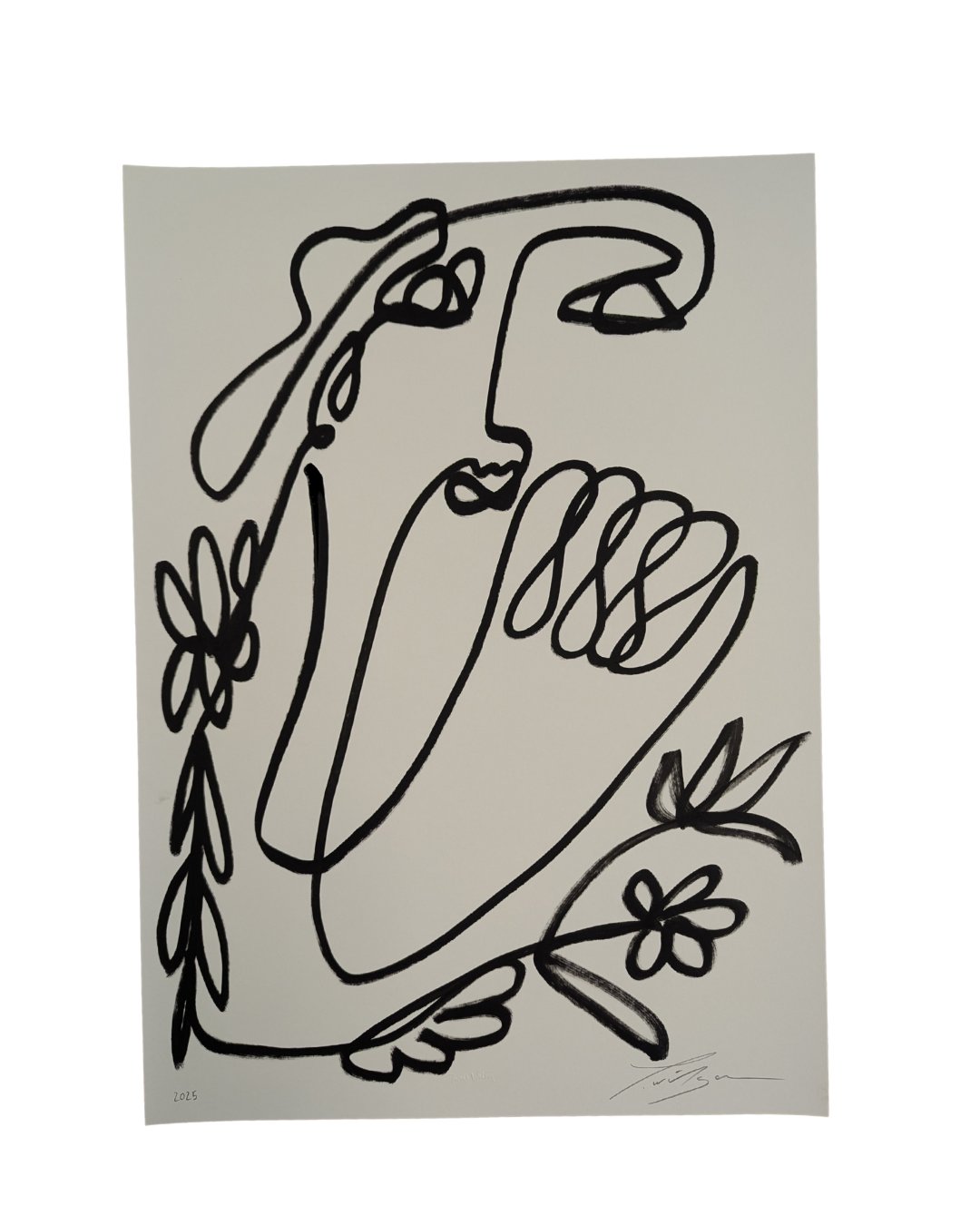 Holding Myself depicts a figure wrapped in its own arms, framed by blooming botanical forms. It represents healing, self-trust, and rebuilding, themes central to this collection. The flowing single line mirrors the emotional loops we navigate during periods of change. Acrylic ink gives depth and softness to this intimate composition.